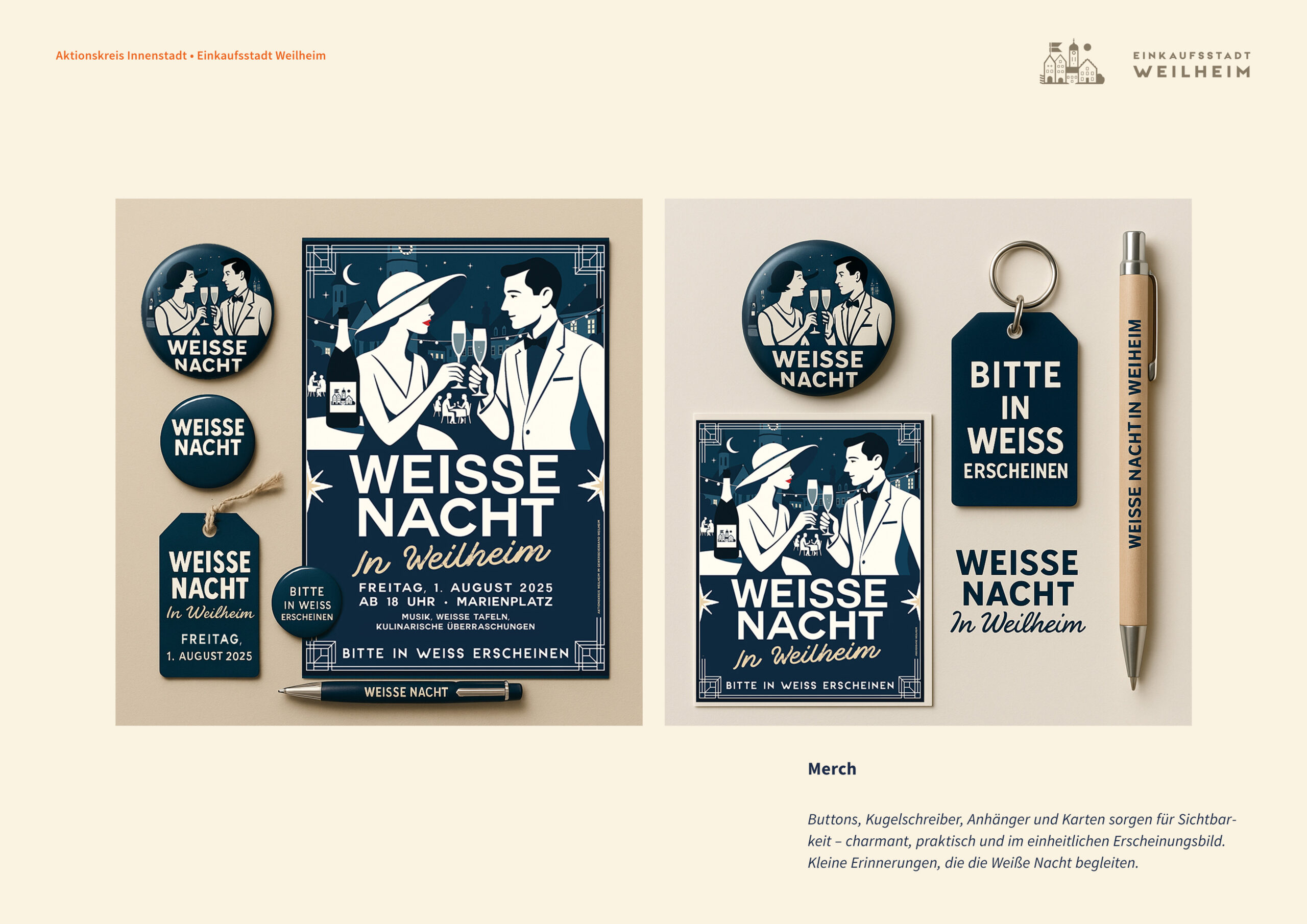 Der Dresscode in Weiß wird zum visuellen Leitfaden – für Plakat, Social Media, begleitende Printmaterialien und lokale Anzeigen. Das Logo der Einkaufsstadt Weilheim wird dezent integriert, die Gastronomie mit ihren gedeckten Tischen, weißen Kellneroutfits und festlicher Atmosphäre wird ins Zentrum gerückt. So entsteht ein stilvoller Rahmen für ein städtisches Fest der besonderen Art.