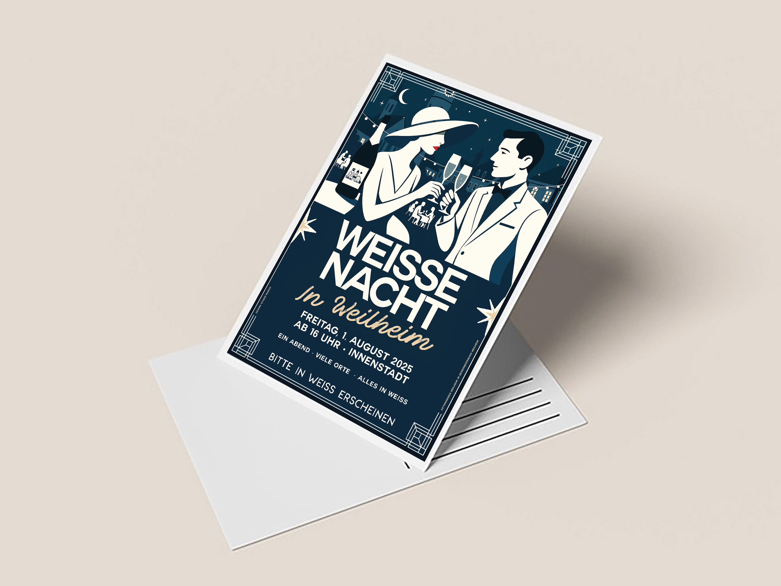 Studio Marco entwickelte das zentrale Plakatmotiv, das die Stimmung des Abends bereits im Vorfeld fühlbar macht: eine laue Sommernacht, funkelnde Sterne, schimmernder Champagner und weiß gekleidete Menschen auf lichtgedeckten Plätzen. Das Design zielt bewusst auf eine ästhetische Verdichtung des Moments: italienisches Flair trifft auf urbane Eleganz.